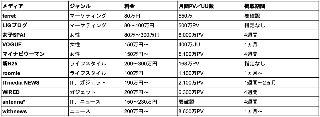 メディアごとの記事広告掲載にかかる費用と特徴をまとめました。自社商品と相性の良いメディア探しの参考にしてみてください。
